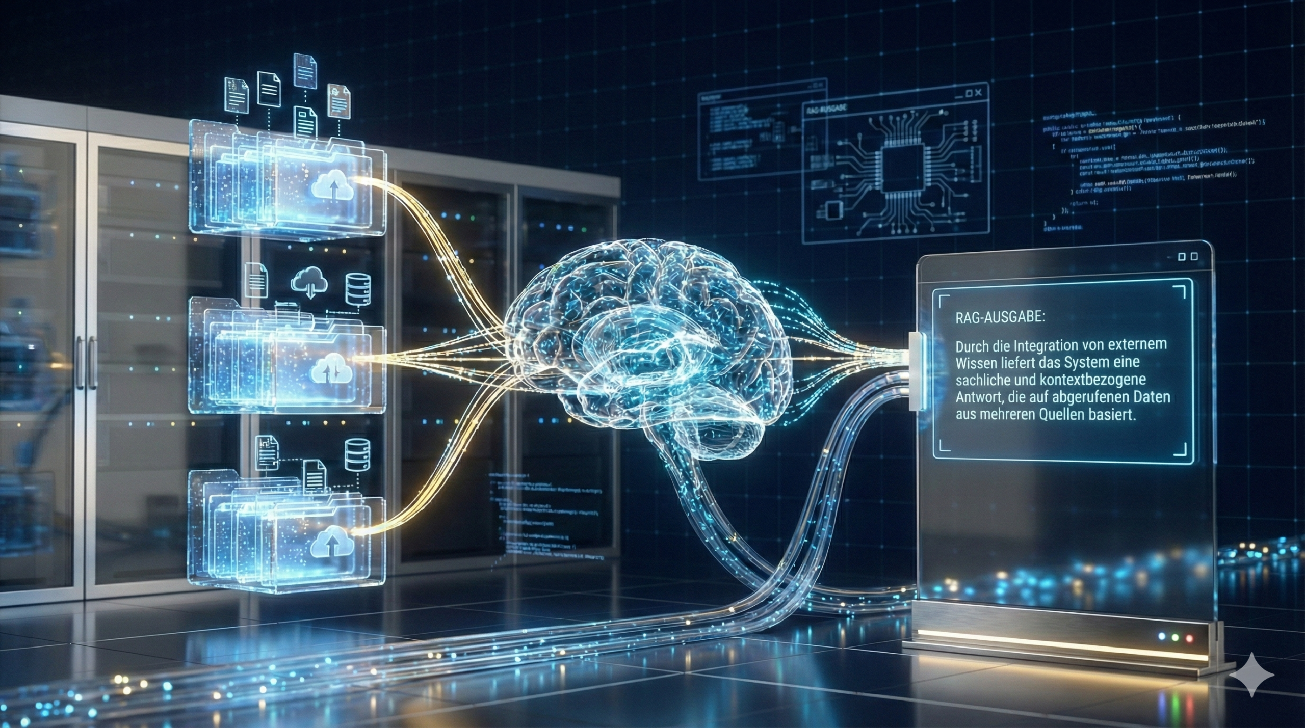 - Retrieval (Abruf): Das System sucht in einer externen Wissensbasis (z. B. Dokumente, Datenbanken, Websites) nach relevanten Informationen.