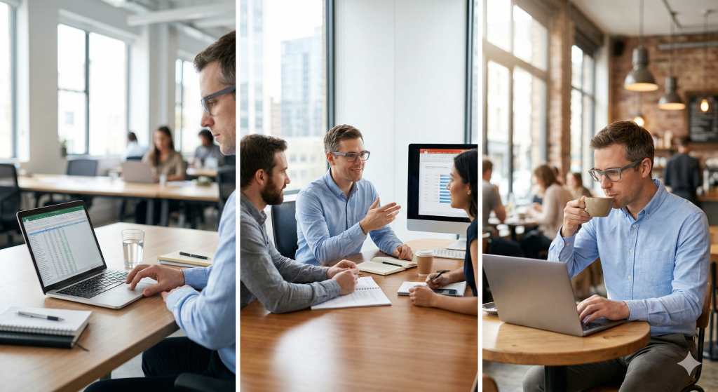 1) am Laptop im Büro, 2) im Meeting mit Kollegen, 3) beim Kaffee im Café.